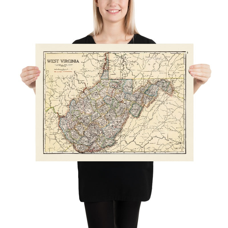 Produced by the prestigious George F. Cram Company—established in 1867 and renowned for atlases that married precision with practical utility—this map embodies the firm’s early twentieth-century aesthetic. Cram’s editors distilled immense datasets into legible hierarchies, using disciplined palettes and fine linework to balance beauty with use. Trained in the traditions of American commercial cartography yet alert to modern travel, they were quick to foreground highways, state roads, and electric lines alongside political boundaries and population figures. In 1920 that editorial stance mattered: motorists pressed beyond rail corridors, interurban lines stitched together industrial towns, and state commissions rationalized road systems. Cram captured that transition with quiet authority, rendering West Virginia’s administrative grid and mountain physiography as the fixed stage upon which new mobility unfolded.