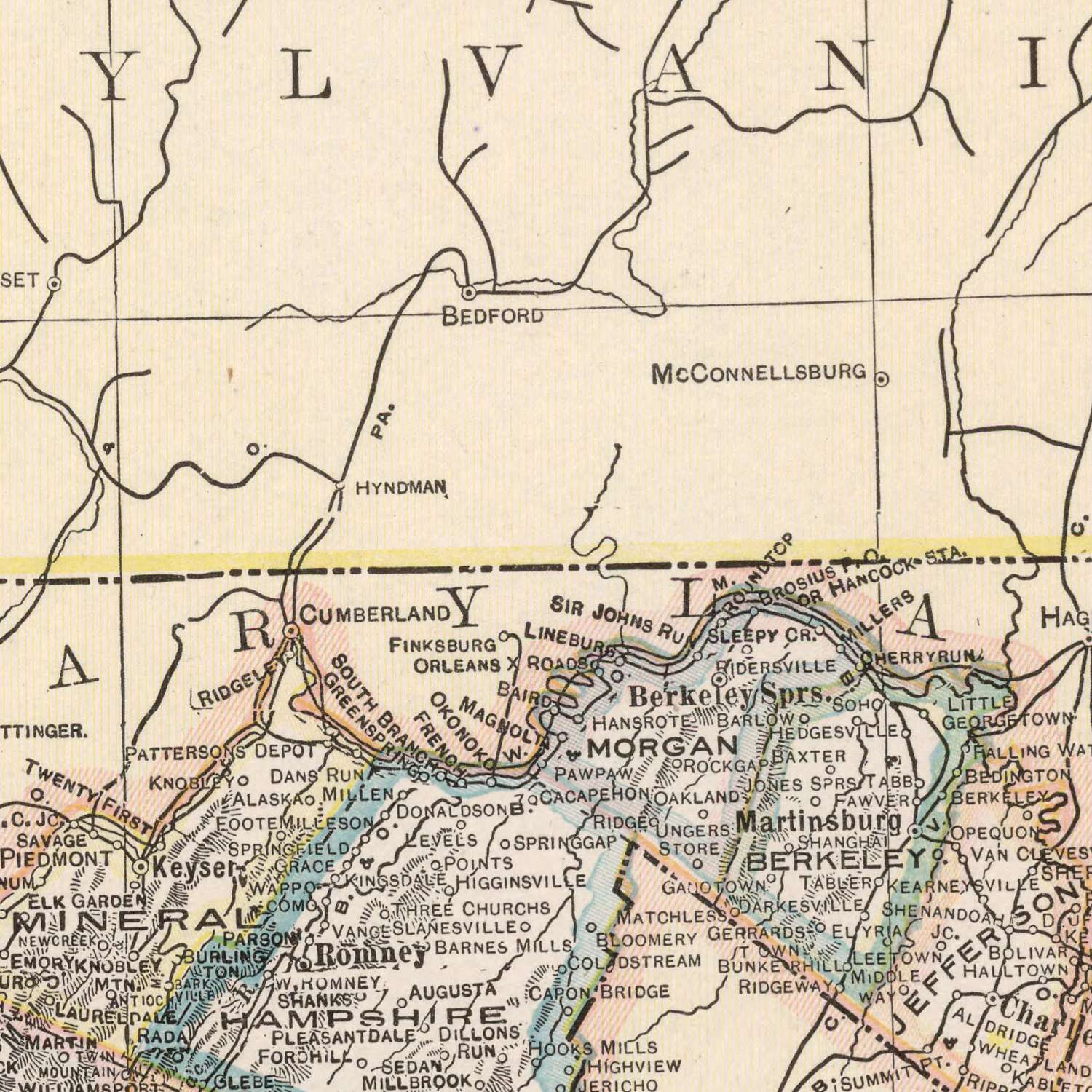 Politically, counties are crisply partitioned in green, their seats neatly identified, giving instant comprehension of West Virginia’s administrative mosaic in 1920. Kanawha County asserts its centrality with Charleston as capital, while Ohio County clusters around venerable Wheeling at the northern bend of the river. Cabell centers on Huntington; Wood on Parkersburg; Monongalia and Harrison bracket Fairmont, Morgantown, and Clarksburg across the northern coal belt; Berkeley orients Martinsburg toward the mid-Atlantic; Raleigh signals Beckley’s ascent on the southern plateau; Hancock and Brooke squeeze into the Northern Panhandle with Weirton’s burgeoning steelworks between river and ridge; Mineral sets Keyser along the Potomac corridor. Paired with census figures of the same year, the pattern reveals an urban network swelling along energy seams and water routes, even as courthouse towns anchor the rural highlands.