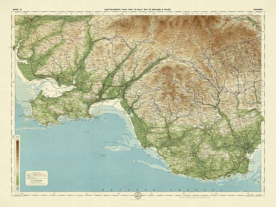 El uso innovador del color por parte de Bartholomew para representar el relieve del paisaje es particularmente impactante en este mapa. La sutil gradación de bandas de color para indicar diferentes elevaciones da vida a la geografía física del sur de Gales. Desde las verdes tierras bajas hasta los escarpados picos de la Montaña Negra y los Brecon Beacons, el mapa captura la diversa topografía de la región con una elegancia que es tanto informativa como estéticamente placentera. Esta técnica, basada en un mapa de la Oficina de Ordenación del mismo período, muestra el compromiso de Bartholomew de combinar la precisión científica con la belleza artística.