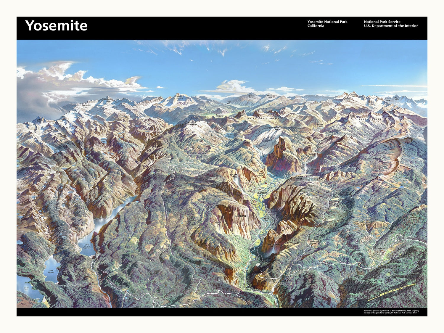 Heinrich C. Berann’s panoramic Yosemite is a luminous synthesis of art and geographic truth, a sweeping 1989 vision of California’s crown jewel thoughtfully refined by the Harpers Ferry Center of the National Park Service in 2017. From an elevated, cinematic perspective, the composition releases granite, water, and sky into a coherent, navigable world. Its historical resonance lies in how it crystallizes late twentieth-century conservation values: a national park rendered with both reverence and instructive clarity, inviting stewardship as much as sightseeing. Berann’s renowned modeling of terrain and atmosphere makes this not merely a view, but a cultural portrait—an image that helped define how generations visualize America’s protected landscapes and understand the responsibilities that come with preserving them.