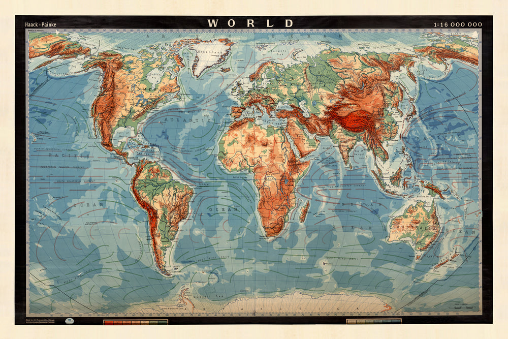 El mapa está dominado por las grandes masas de tierra de Europa, Asia y África. Las Américas se muestran en la esquina inferior izquierda, y Australia se muestra en la esquina inferior derecha. El mapa está centrado en el meridiano de Greenwich, y se marcan el Trópico de Cáncer y el Trópico de Capricornio. El mapa también muestra las principales corrientes oceánicas, así como las ubicaciones de las principales cadenas montañosas y desiertos. El estilo artístico del mapa es típico de la época, con un enfoque en la precisión y el detalle. El mapa se proyecta utilizando la proyección de Mercator, que es una proyección cilíndrica que preserva las formas de las masas de tierra pero distorsiona su tamaño.