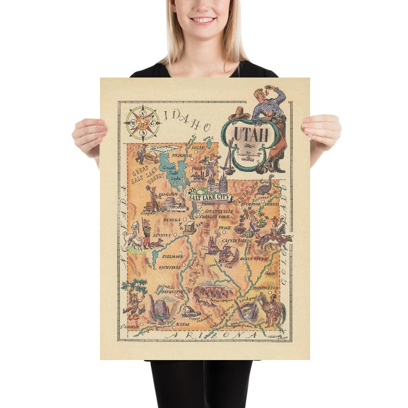 Titled Utah Small State Map, Jacques Liozu’s 1946 pictorial gem captures the Beehive State with a mid-century verve that fuses geography, livelihood, and leisure. Liozu arranges Utah as a storybook panorama, punctuated by lively vignettes and crisp captions that celebrate the state’s mines, farms, parks, and bustling towns. A jaunty compass rose in the upper left orients the eye as decorative lettering unfurls across valleys and plateaus, guiding the viewer from the Wasatch Front to the canyonlands. The composition epitomizes Liozu’s celebrated blend of information and charm: each symbol teaches while it delights, and every icon—be it an irrigated field, a headframe, or a cowboy—works in concert to narrate Utah’s identity at mid-century. The result is a portrait that is at once playful and precise, brimming with civic pride.
