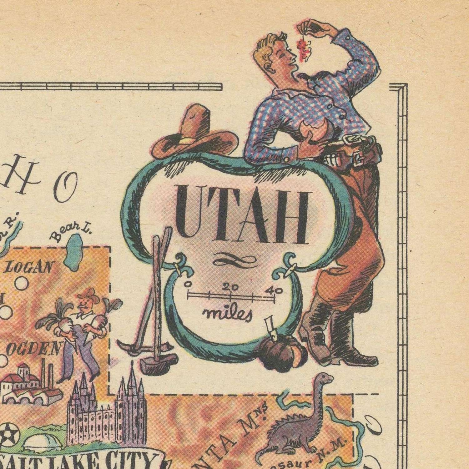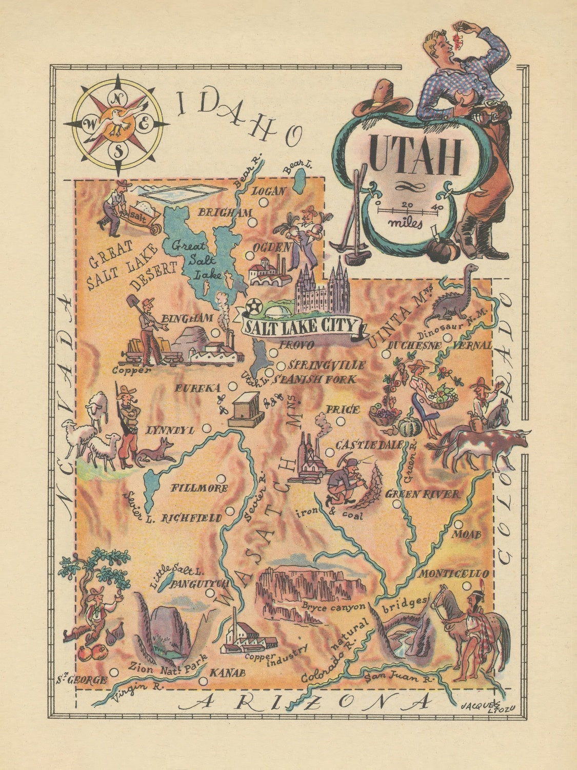Jacques Liozu, renowned for regional maps that braid culture with terrain, channels the post-war appetite for informative yet inviting cartography. His small-format, bird’s-eye approach distills complexity without flattening character, using vibrant illustration to make memory maps of place and purpose. The playful cowboys and local fauna aren’t mere ornament; they temper industry with myth, reminding viewers that Utah’s economy grew in dialogue with its dramatic landscapes. Decorative scripts, bright iconography, and that jaunty compass rose work together to tutor the eye, nudging it from landmark to livelihood to leisure. In 1946, as Americans rediscovered the road and regions reasserted identity, Liozu fixed Utah in an unforgettable frame—self-reliant, industrious, spectacularly scenic, and alive with human possibility.