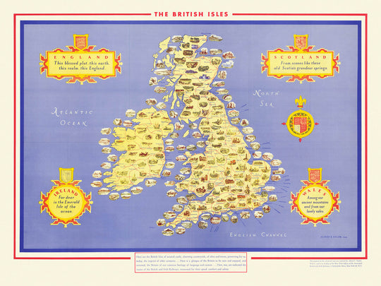 Alfred E. Taylor, conocido por su habilidad para combinar la representación artística con información práctica, creó este mapa para capturar la imaginación de los viajeros de todo el mundo. Su trabajo tenía la intención de resaltar la riqueza cultural e histórica de las Islas Británicas, ofreciendo un viaje visual a través del tiempo. El mapa de Taylor es más que una simple representación geográfica; es una celebración de la importancia histórica de la región y un llamado a explorar sus muchas maravillas.
