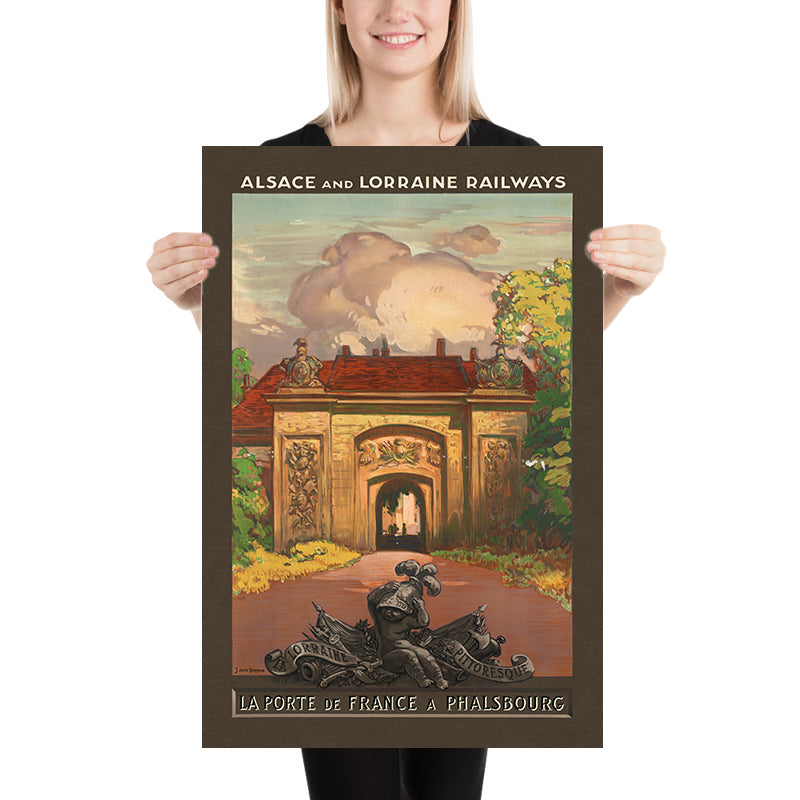 Why this subject matters: Phalsbourg’s “Porte de France” is a cherished landmark, standing as a ceremonial threshold to the town and a reminder of the region’s layered history at the crossroads of Lorraine and Alsace. Posters like this not only guided visitors to specific destinations; they also elevated the journey itself, marrying civic pride with the romance of mobility. In its original context, this image would have graced station walls and travel halls—an invitation to linger, look, and go.