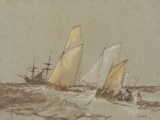 "Shipping" demonstrates Turner at his luminous best, with vessels thrown into a golden and hazy seascape, suffused with glowing yellow and creamy whites. Loose but confident brushwork conjures not just the forms of the boats and sails, but the monumental sense of movement, mist, and sun-flecked air. The masterful interplay of bright yellow and pale tones evokes the intangible, fleeting radiance of sunlight on water, while understated hints of brown and grey anchor the scene in reality.