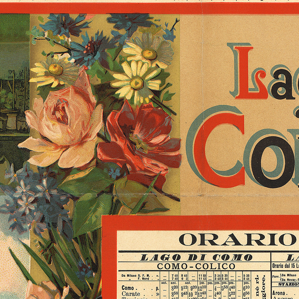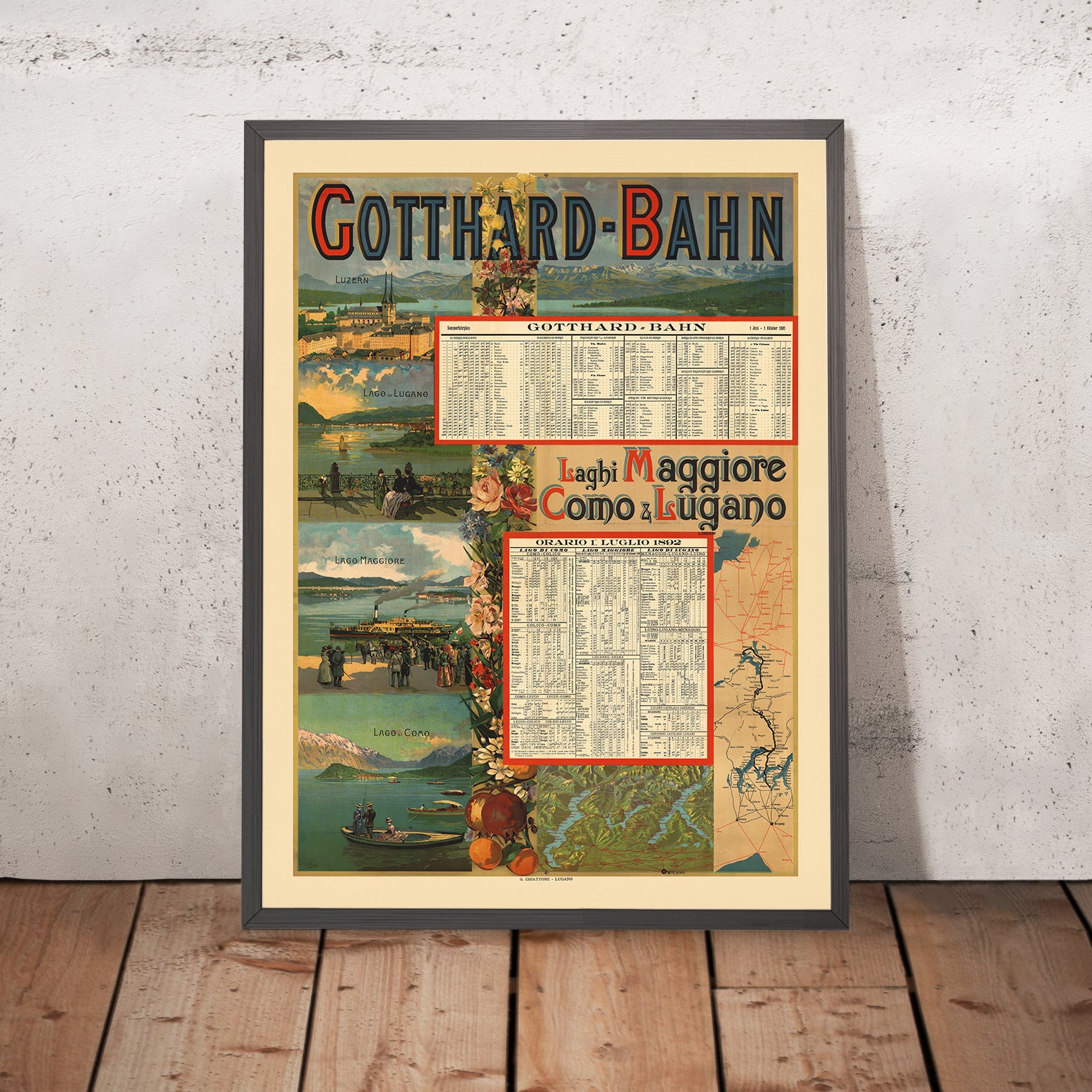 Why this subject matters: The Gotthard Railway was a marvel of its age, threading through the Alps to link German-speaking Switzerland with Ticino and onward to Italy. By the 1890s, rail made the lake district newly accessible to holidaymakers, who could step from panoramic carriages to promenades shaded by palms and camellias. This poster’s celebration of Lugano, Maggiore, and Como reflects that cultural crossroads—Swiss precision meeting Mediterranean light—and helped define the region’s image as a refined, international playground.