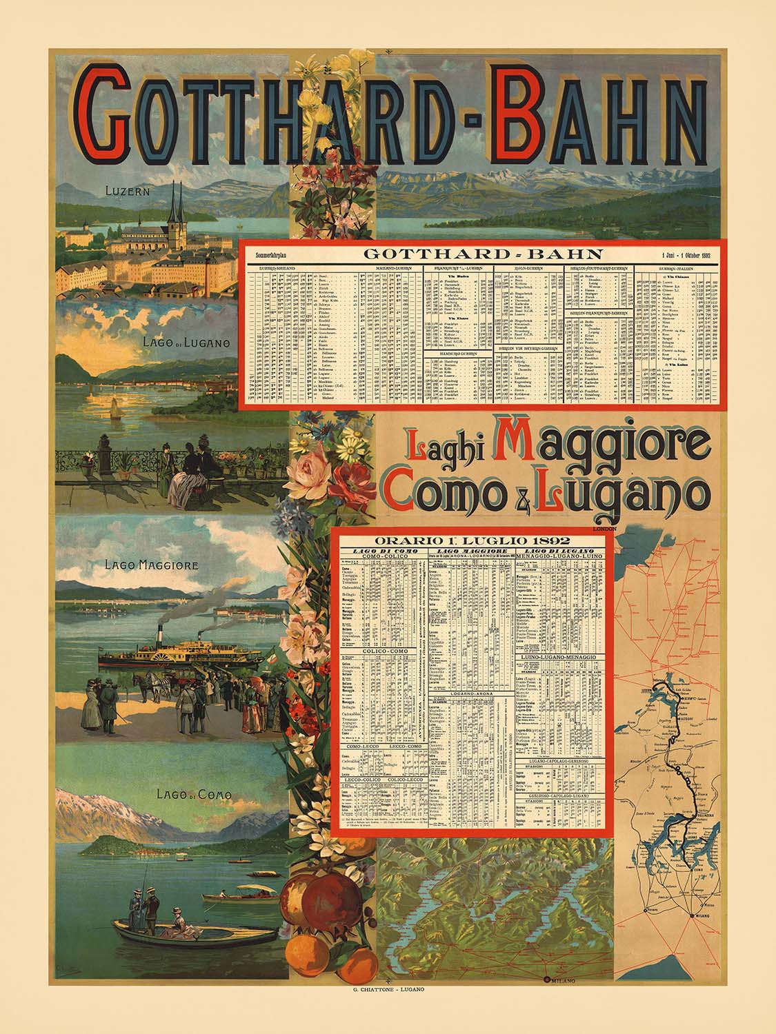 Swiss-Italian Lakes Travel Poster: Gotthard-Bahn, Laghi Maggiore, Como und Lugano by Gabriele Chiattone, 1892