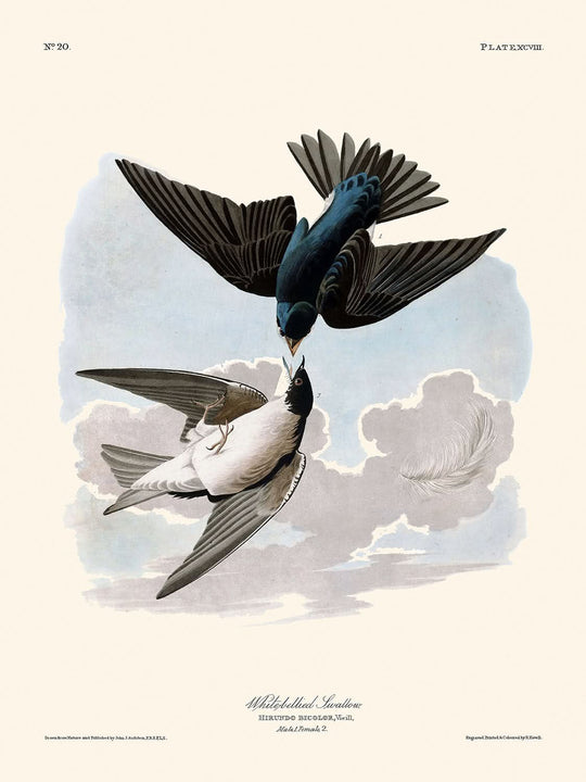 La "Golondrina de vientre blanco" de John James Audubon, creada originalmente en 1827, es una exquisita ilustración de aves de su famosa serie "Aves de América". Esta obra de arte en particular captura la delicada belleza y la presencia dinámica de la golondrina de vientre blanco, un ave conocida por su elegante vuelo y su vibrante comportamiento en los cielos estadounidenses.