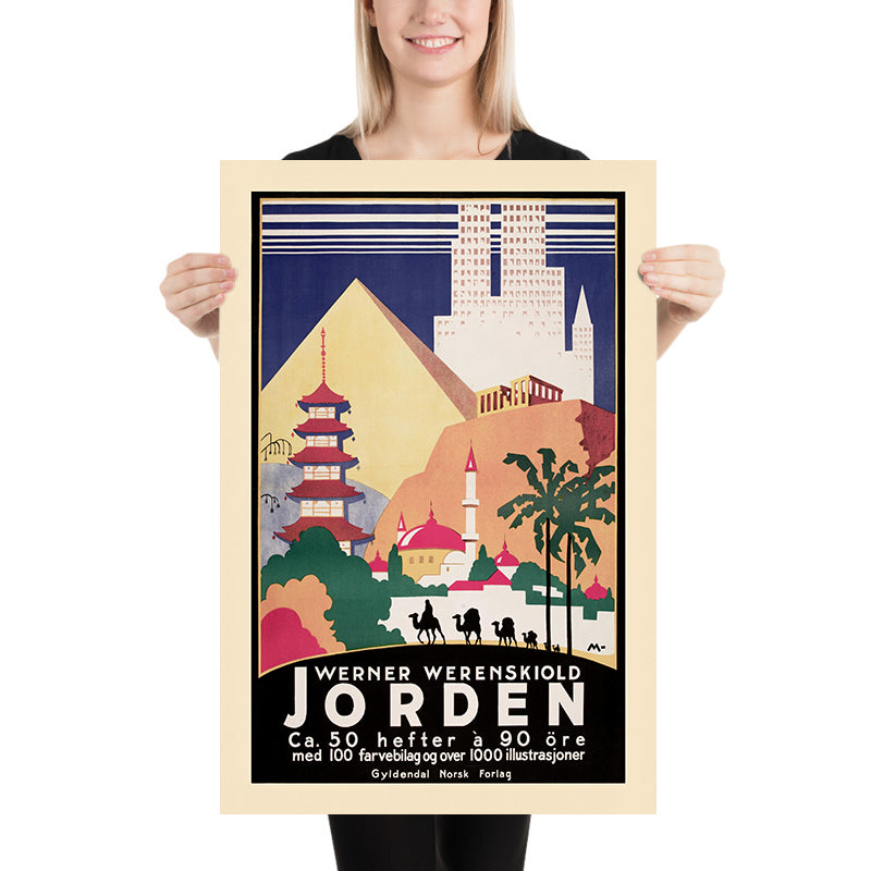 Jorden by Werner Werenskiold is a striking Art Deco travel poster that captures the spirit of early 20th‑century wanderlust. Designed to promote the publication “Jorden” (Norwegian for “The World”), the composition channels the optimism of the interwar years, when steamships, railways, and the dawn of commercial flight brought far‑flung destinations within reach. Stylized global landmarks—such as a tiered pagoda and desert pyramids—signal an invitation to explore cultures across continents, while bold, modern typography anchors the poster’s promotional purpose.