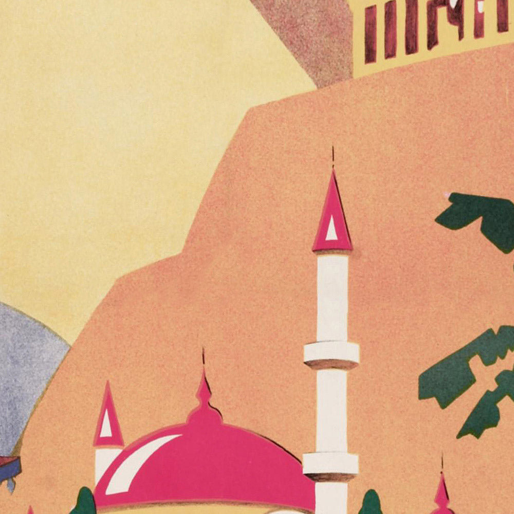 Why this poster matters: Jorden distills the global imagination of its era into a single, compelling image. The Art Deco movement favored streamlined geometry, simplified silhouettes, and eye‑catching lettering that could be read at a glance—all perfectly suited to travel publicity. By pairing instantly recognizable architectural forms from different regions, the poster speaks to an age of increasing mobility and curiosity about the wider world, reflecting advances in printing and design that pushed posters from mere announcements to collectible art.