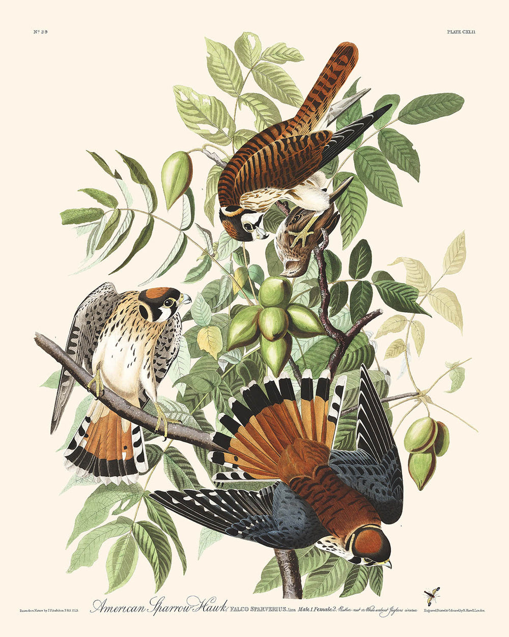 John James Audubon était un naturaliste et peintre pionnier, dont l'œuvre monumentale, Les Oiseaux d'Amérique, se compose de 435 gravures en couleur à la main qui restent inégalées par leur détail et leur qualité réaliste. Le dévouement d'Audubon à capturer les oiseaux en formats grandeur nature a permis une précision et une échelle incroyables, rendant chaque oiseau, y compris le Faucon Épervier Américain, avec une précision anatomique exquise et une posture dynamique.