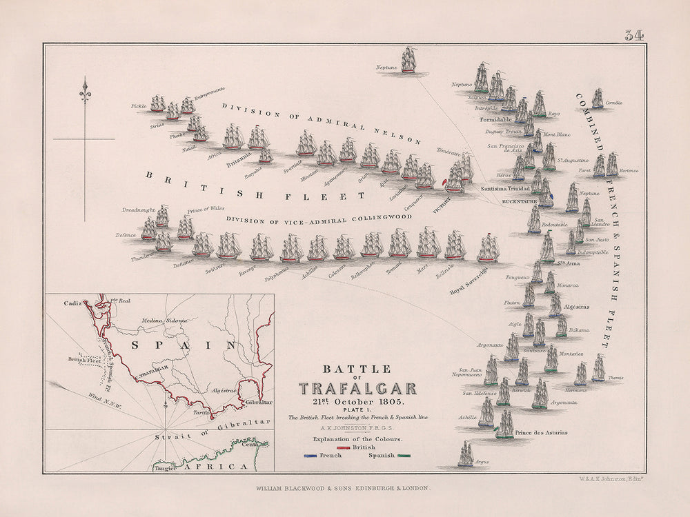 La "Bataille de Trafalgar : La flotte britannique brisant la ligne française et espagnole" est particulièrement remarquable pour sa représentation vivante de la bataille navale historique entre l'amiral Nelson et les flottes de Napoléon Bonaparte. L'utilisation de la couleur par Johnston insuffle de la vie à la scène, avec les troupes britanniques marquées en rouge, les françaises en bleu et les espagnoles en vert. La carte insets soigneusement gravée d'une partie de l'Espagne et du détroit de Gibraltar améliore le contexte géographique de la bataille, en faisant une pièce visuelle et éducative intrigante.