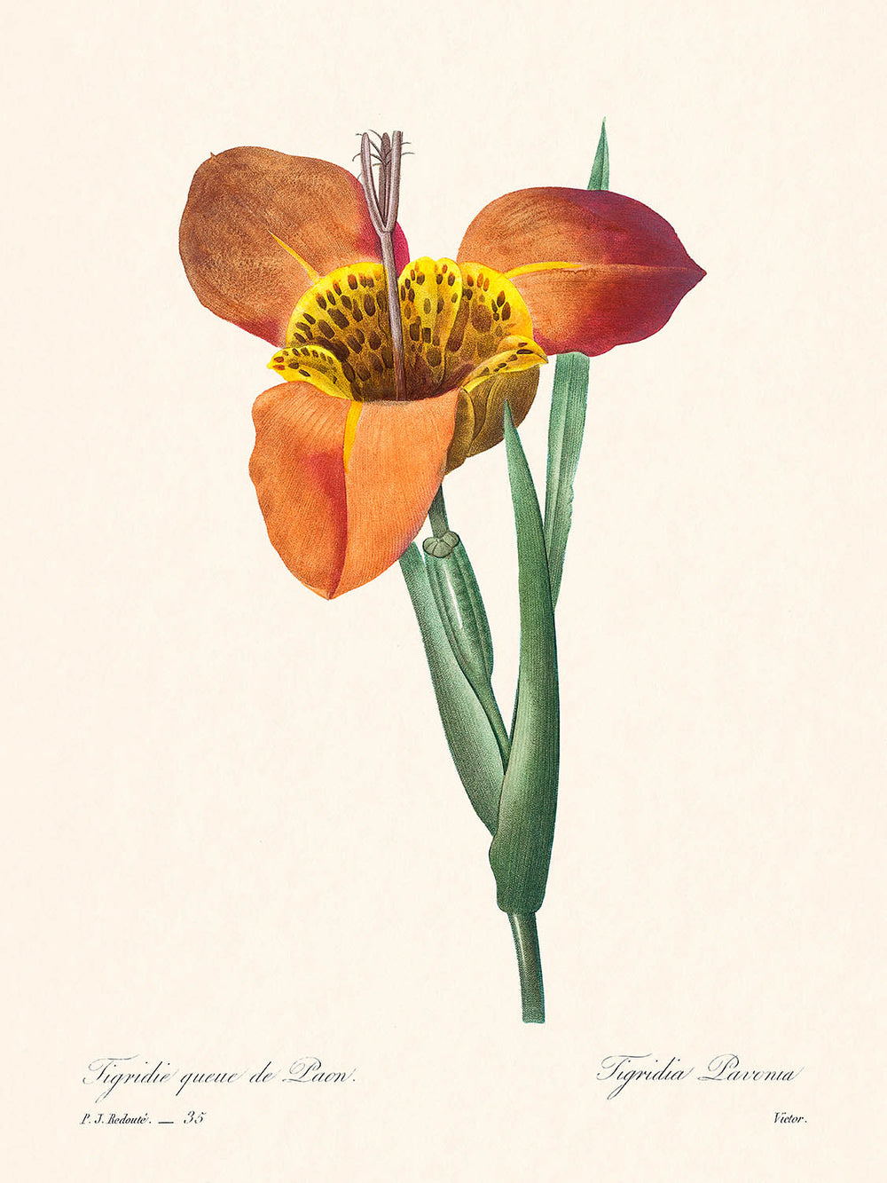 Cette œuvre d'art, Mexican Shell, illustre l'exceptionnelle compétence de Redouté à représenter les détails complexes et les teintes vibrantes des spécimens botaniques. Le style d'illustration botanique victorien allie précision scientifique et beauté artistique, en faisant une pièce précieuse pour les amateurs d'art et les passionnés de botanique.