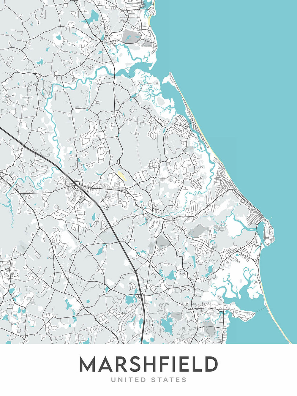 Plan de la ville moderne de Marshfield, MA : plage de Brant Rock, domaine Daniel Webster, plage de Green Harbour, plage de Rexhame, South River