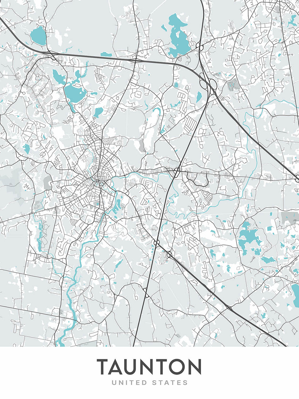 Cette carte de Taunton, Massachusetts, est un plan de rue moderne et détaillé sans étiquettes. Il se concentre sur le centre-ville et ses environs, offrant une représentation précise et visuellement attrayante de cette charmante ville. La carte couvre une superficie d'environ 16 milles d'ouest en est et 11 milles du nord au sud, offrant une vue complète de l'aménagement de la ville et de ses relations avec les villes et les monuments environnants.