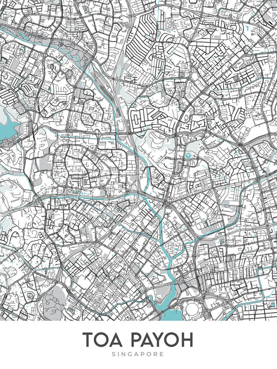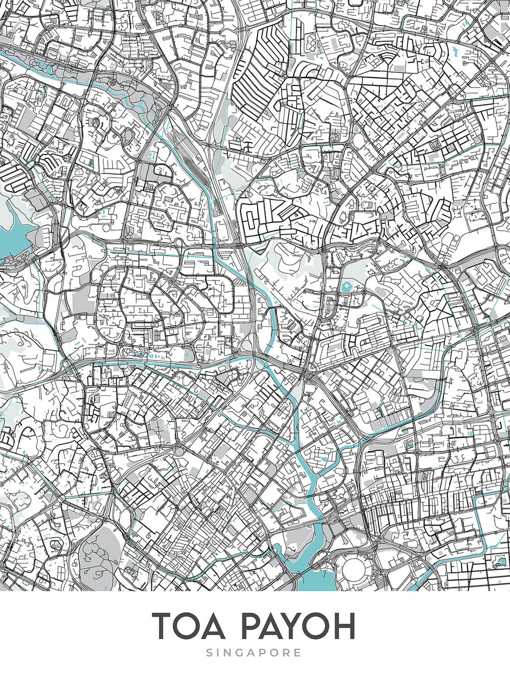 Niché au sein de la vibrante cité-État insulaire de Singapour, le quartier de Toa Payoh constitue le point central de cette carte extrêmement détaillée. Réputé pour son riche mélange de culture et de modernité, Toa Payoh offre un aperçu unique des facettes historiques et contemporaines de la vie urbaine singapourienne. La carte capture l'essence de cette zone animée, mettant en valeur son réseau complexe de routes, ses monuments remarquables et ses espaces verts luxuriants. Il fournit non seulement une représentation visuelle mais également une interprétation artistique de l'aménagement du quartier, ce qui en fait une pièce fascinante pour ceux qui s'intéressent aux subtilités du design urbain et de l'architecture.