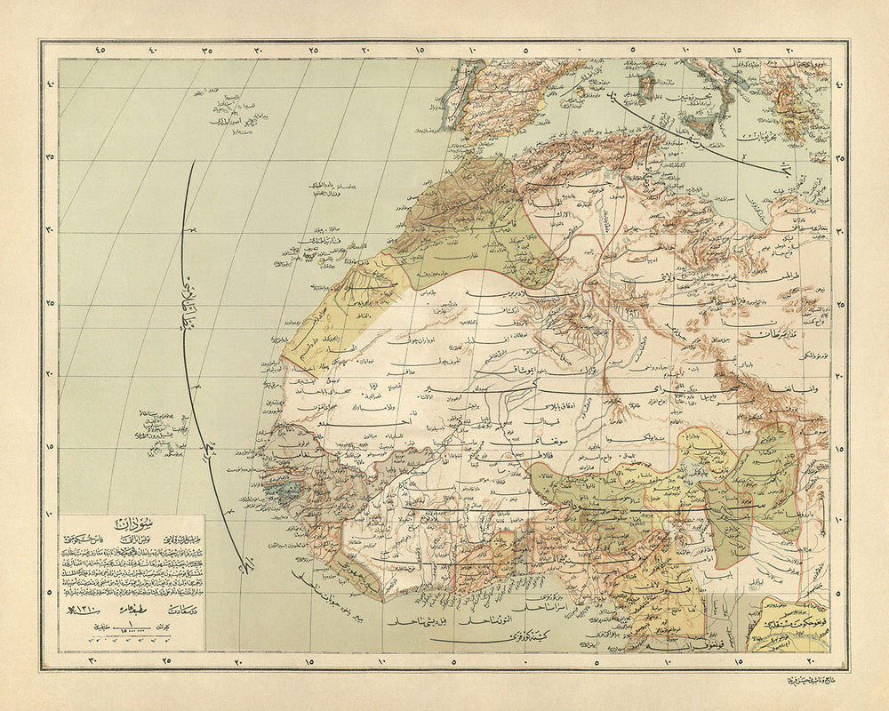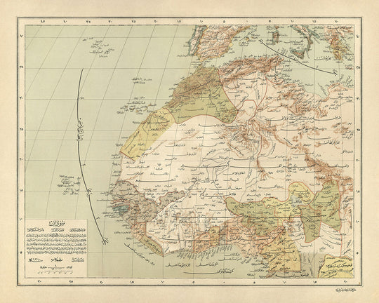 Plongez dans la riche tapisserie de l'Afrique du Nord-Ouest à travers l'objectif du remarquable « Harita-i Afrika-i Garbiyye ve Soudan », un chef-d'œuvre réalisé par le estimé Hafiz Ali Esref en 1894. Cette carte exquise, témoignage de l'excellence cartographique de son époque, offre un aperçu sans précédent de la géographie politique et physique d’une région chargée d’histoire et de diversité culturelle. Hafiz Ali Esref, ancien militaire devenu cartographe en chef, a perfectionné ses compétences à Paris avant de prendre la tête de la prestigieuse presse Matbaa-i Amire à Beyazit. Son attention méticuleuse aux détails et sa profonde compréhension de la géographie sont clairement mises en valeur dans cette œuvre, qui s'étend des rues animées de Marrakech aux paysages sereins du Sahara, résumant l'essence de l'Afrique du Nord-Ouest avec une précision remarquable.