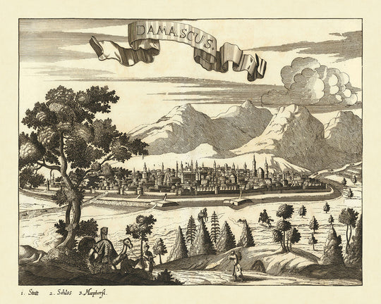 Cette carte de Damas n'est pas seulement une représentation géographique mais une fenêtre sur le passé, mettant en valeur les quartiers et les monuments importants de la ville. Les bâtiments regroupés et les rues sinueuses de la ville antique sont méticuleusement détaillés, offrant un aperçu de la configuration urbaine de Damas à la fin du XVIIe siècle. Les dômes et minarets proéminents qui parsèment l'horizon sont magnifiquement illustrés, reflétant le patrimoine architectural de la ville et son importance en tant que centre de culture et d'apprentissage islamiques.