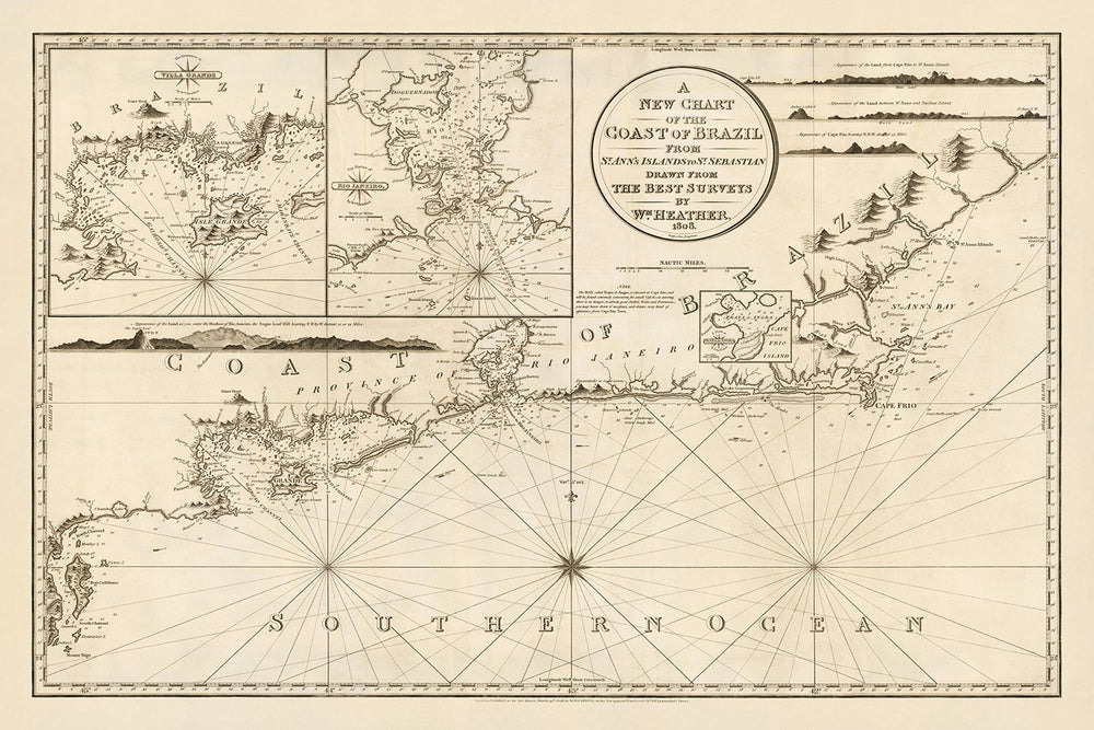 Cette carte marine exceptionnelle, intitulée "Une Nouvelle Carte de la Côte du Brésil de l'Île de St. Ann à St. Sebastian," est un témoignage du travail méticuleux de William Heather, un hydrographe et cartographe britannique renommé du début du 19ème siècle. Créée en 1802 et publiée en 1808, cette carte capture un moment clé de l'histoire maritime, coïncidant avec l'année où la famille royale portugaise s'est déplacée à Rio de Janeiro au milieu des guerres napoléoniennes. Heather, connu pour ses cartes nautiques précises et détaillées, a utilisé des relevés effectués par la Marine portugaise, offrant une précision inégalée dans la représentation de la côte brésilienne à une époque où la région était un point névralgique pour les activités maritimes britanniques et américaines.