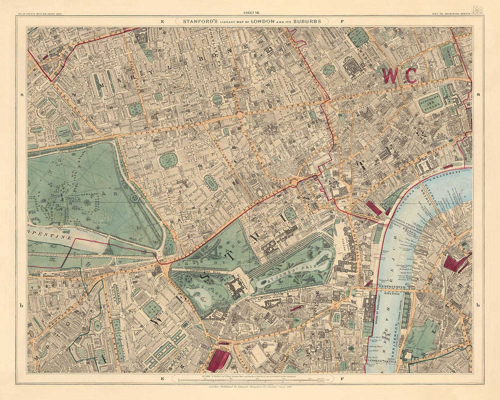 La carte a été initialement publiée en 24 feuilles. Au total, la carte aurait mesuré environ 2 mètres de large (78 pouces). Voici la feuille 10, qui se concentre sur le borough central de Londres de Westminster et des parties de Lambeth.