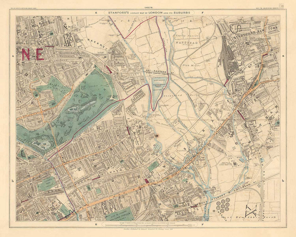 La carte a été publiée à l'origine en 24 feuilles. Au total, la carte aurait mesuré environ 2 mètres de large (78 pouces). Voici la feuille 8, qui se concentre sur les arrondissements de l'est de Londres, Hackney et Tower Hamlets.