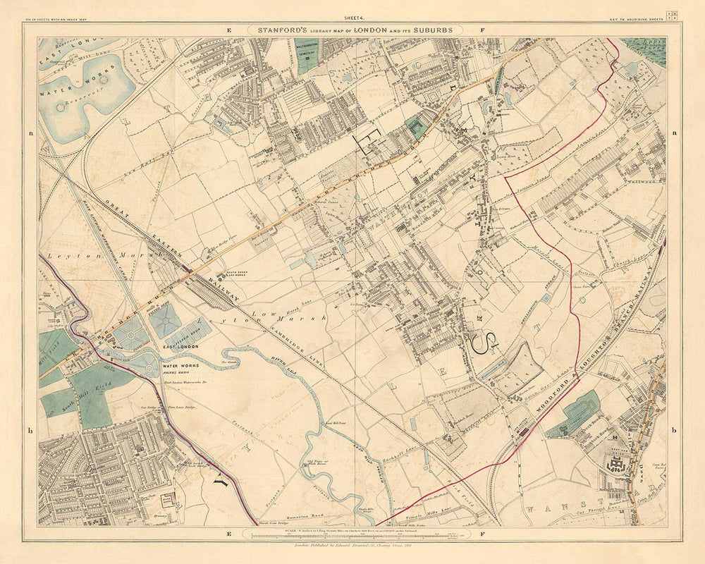 La carte a été publiée à l'origine en 24 feuilles. Au total, la carte aurait mesuré environ 2 mètres de large (78 pouces). Voici la feuille 4, qui se concentre sur les zones du nord-est de Londres de Walthamstow et Leyton dans le borough de Waltham Forest.