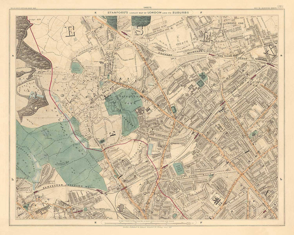La carte a été initialement publiée en 24 feuilles. Au total, la carte mesurait environ 2 mètres de large (78 pouces). Voici la feuille 2, qui se concentre sur Highgate et les arrondissements du nord de Londres de Camden, Haringey et Islington.