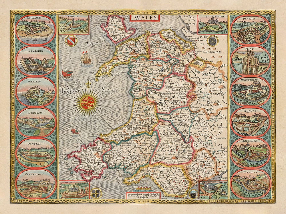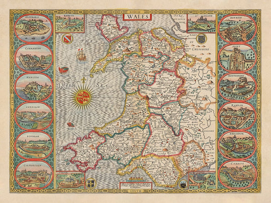 La plupart des villes, villages et cités les plus notables du Pays de Galles sont déjà clairement visibles sur cette ancienne carte - bien que certaines villes et comtés aient eu des noms légèrement différents à l'époque, comme Brecon qui était appelé Breknok, et le Pembrokeshire qui était appelé Penbrokshire.