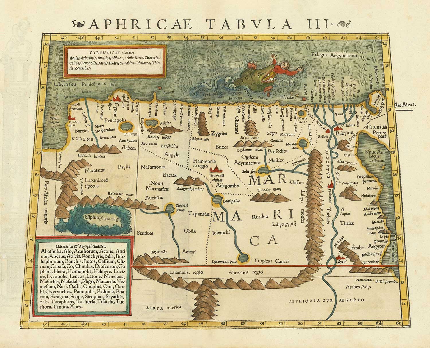 Une carte détaillée pour son époque, montrant des montagnes à travers les pays et le Nil s'écoulant du sud vers la mer Méditerranée, étiquetée "Pelagus Aegyptiacum." La mer d'Égypte.