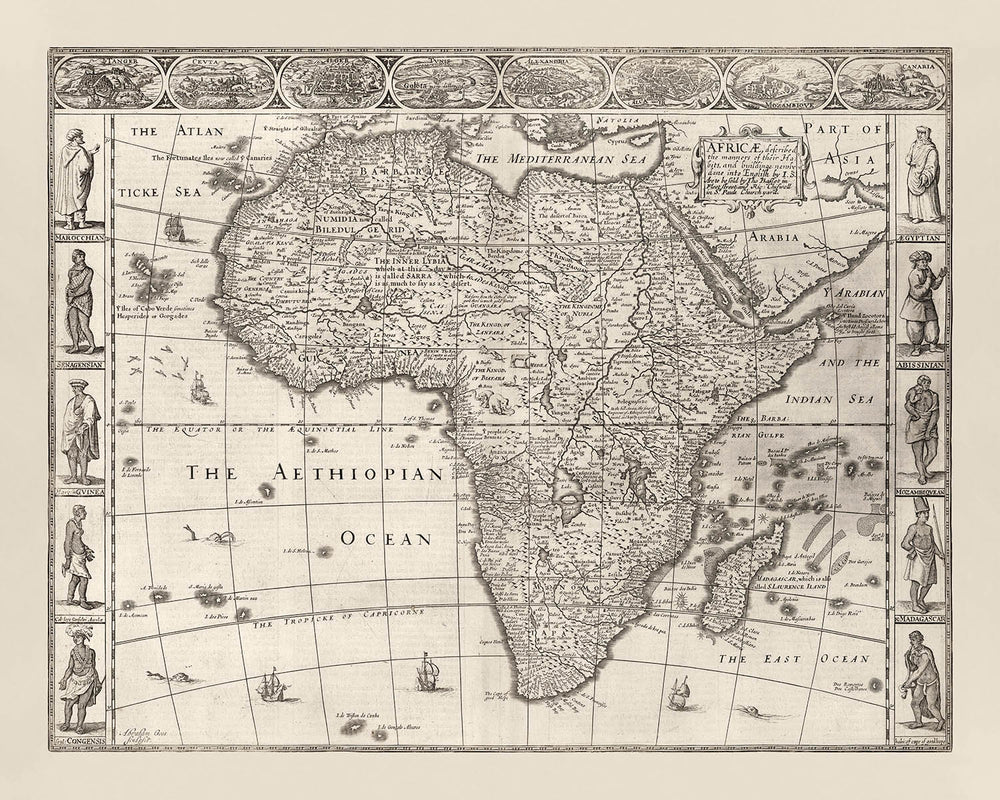 Cette carte témoigne des thèmes et des sujets qui ont fasciné l'Europe moderne, illustrant les paysages politiques et physiques de l'Afrique avec une précision remarquable. Elle capture l'immensité du continent, de la mer Méditerranée au nord aux royaumes mystérieux de « l'océan éthiopien » au sud. La carte fait également allusion à la riche mosaïque culturelle de l'Afrique, avec des représentations de costumes locaux et de scènes de la vie quotidienne le long de ses marges, offrant un aperçu des diverses sociétés qui ont prospéré à travers le continent.