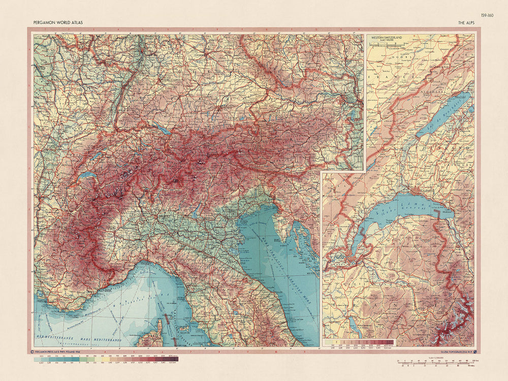 Plongez dans le charme captivant des 'Alpes', une carte politique et physique méticuleusement détaillée, initialement réalisée en 1967 par le réputé Service de topographie de l'Armée polonaise. En tant que carte nationale, elle offre une perspective intrigante de la vaste région géographique qu'elle occupe, traçant avec soin l'interaction complexe entre les frontières politiques et les caractéristiques naturelles. Notamment, la carte comprend une carte supplémentaire de la Suisse occidentale à une échelle de 1:500 000, un témoignage du dévouement du cartographe à une couverture complète et à la précision.