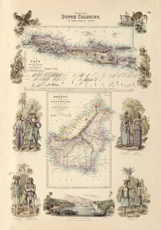 La carte montre l'île de Java et Borneo à l'époque de l'administration de la Compagnie néerlandaise des Indes orientales, avec des illustrations autour de la carte affichant le paysage, la faune et la population des insulaires.