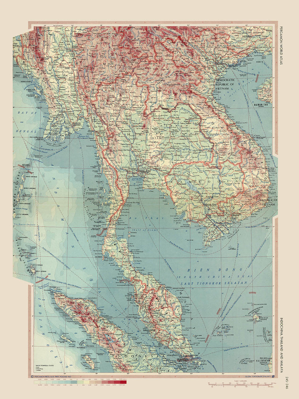 Cette carte de 1967 de l'Indonésie, de la Thaïlande et de la Malaisie, publiée par le Service Topographique de l'Armée Polonaise, est une carte politique et physique détaillée qui offre un aperçu complet de la région. La carte est centrée sur la péninsule malaise, avec la Thaïlande au nord-ouest et la Malaisie au sud-ouest. La carte couvre la plupart de l'Asie du Sud-Est, y compris le Vietnam, le Cambodge, le Myanmar, etc.