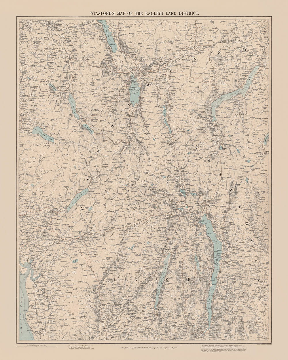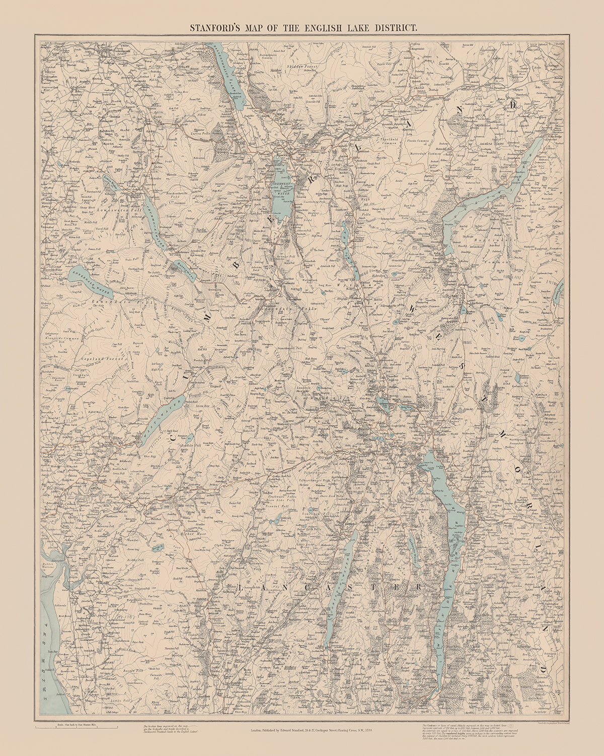 Edward Stanford, figure éminente du monde de la cartographie, était réputé pour sa précision et son dévouement à l'exactitude. Ses cartes étaient très appréciées pour leur détail et leur fiabilité, ce qui en faisait des outils indispensables aussi bien pour les explorateurs que pour les érudits. La création de cette carte en 1899 a coïncidé avec une période où la région des Lacs gagnait en popularité en tant que destination auprès des touristes et des amateurs de plein air, attirés par ses paysages époustouflants et ses eaux sereines.