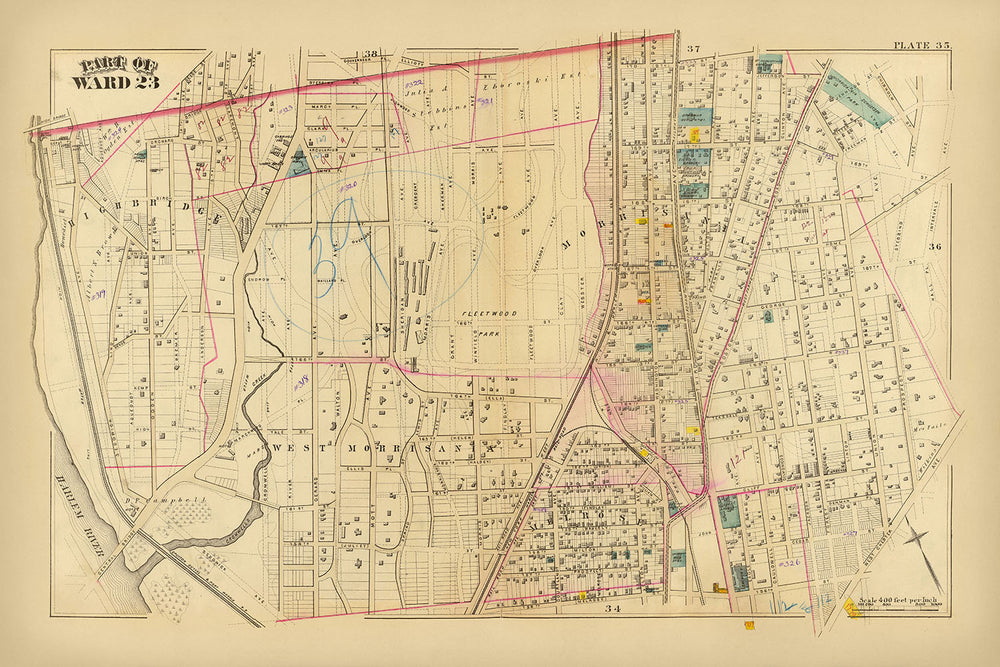 Une des caractéristiques notables de cette carte est sa représentation détaillée de quartiers significatifs tels que Highbridge, West Morrisania et Melrose. Ces zones, riches en histoire et en développement, sont finement cartographiées, offrant un aperçu de la disposition et de la croissance de New York City durant cette période. L'inclusion de lignes de ferme originales et de dimensions de blocs renforce encore la valeur historique de la carte, offrant une perspective unique sur la transformation de la ville des paysages ruraux aux paysages urbains.