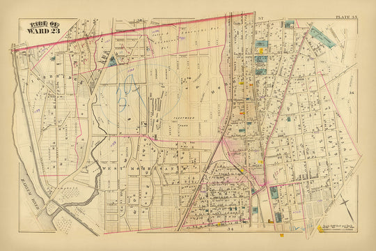 Présentation de l'exquis "Partie du quartier 23, New York City", une carte lithographiée en couleur à la main créée par le cartographe réputé G.W. Bromley en 1879. Cette carte offre un aperçu fascinant du tissu urbain de New York City à la fin du 19ème siècle, mettant en valeur les détails complexes des bâtiments, des bouches d'incendie, des chemins de fer à vapeur et de rue, des cours d'eau d'origine et des limites de quartiers. Le savoir-faire méticuleux de Bromley est évident dans la représentation précise de l'infrastructure et de l'urbanisme, faisant de cette carte un objet précieux pour les historiens et les collectionneurs.