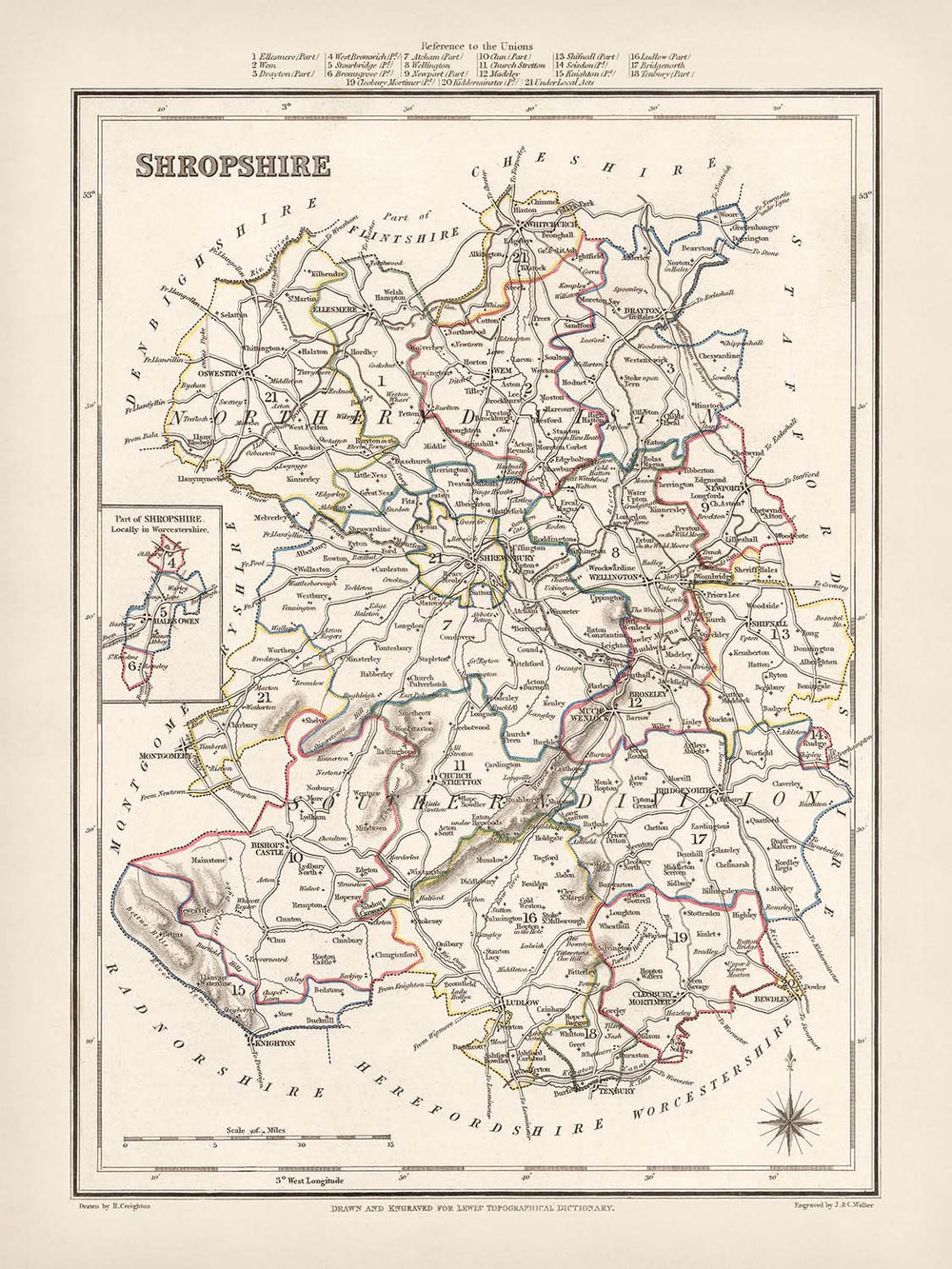 Ancienne carte du Shropshire par Samuel Lewis, 1844: Telford, Shrewsbury, Oswestry, Bridgnorth et Wellington