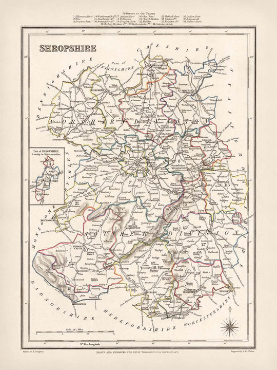 En conclusion, la carte de Shropshire de Samuel Lewis de 1844 sert de fenêtre sur un paysage historique intrigant, marqué par des établissements anciens, des monuments historiques et un passé entrelacé avec l'histoire de la Révolution industrielle.