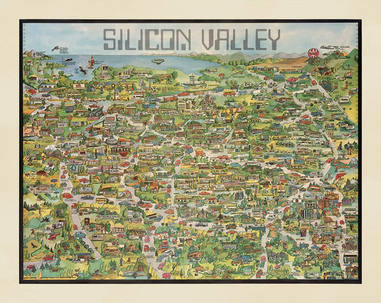 Ancienne Carte de Silicon Valley, 1982: Pictorial Tableau de MountainView, Sunnyvale, Cupertino, San Jose, Fremont