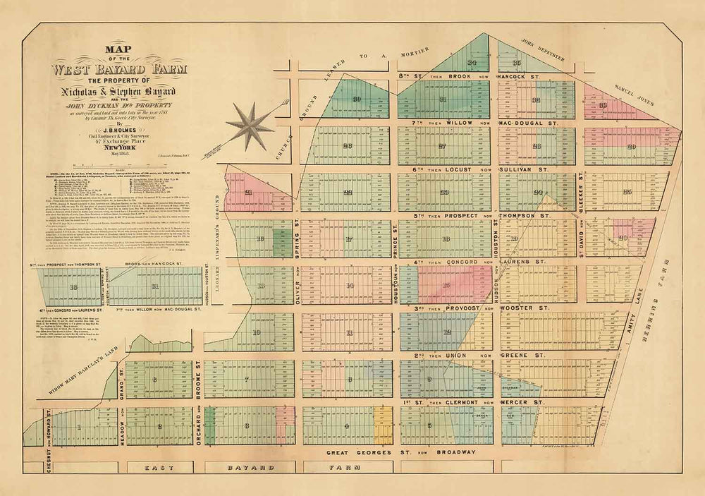 Ancienne carte de SoHo, NYC, 1868 par John Bute Holmes: Manhattan Farmland Survey, Broadway, Bleeker, Houston St