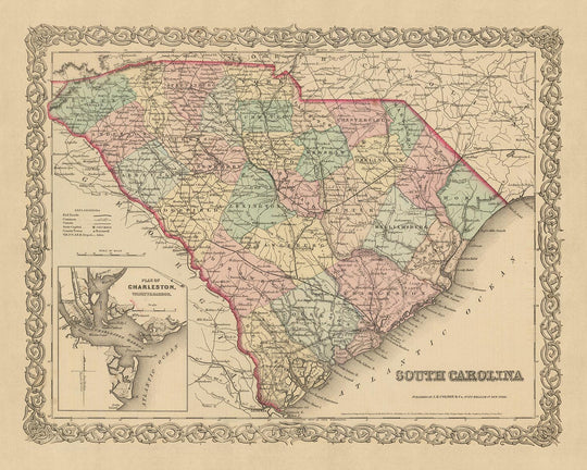 Plongez-vous dans la riche tapisserie de l'histoire américaine avec cette carte exquise de la Caroline du Sud, réalisée en 1859 par le célèbre cartographe JH Colton. Cette pièce nous vient d’une époque où les États-Unis en étaient encore à leurs balbutiements et où le paysage national était en grande partie inexploré et en constante évolution. En tant que telle, cette carte constitue une fenêtre fascinante sur le passé, fournissant un instantané de la Caroline du Sud telle qu'elle était il y a plus de 150 ans.