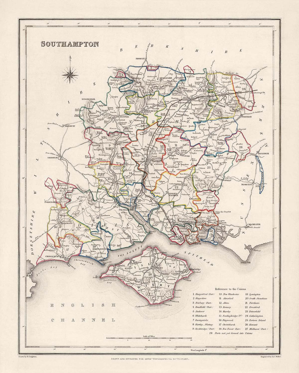 Les limites, rivières et caractéristiques naturelles notables représentées sur la carte incluent la rivière Test, la New Forest, l'île de Wight et le Solent. Ces lieux continuent d'être des attractions touristiques modernes, mettant en valeur la beauté naturelle et l'importance historique de la région.