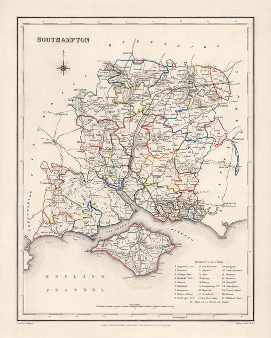 Posséder cette ancienne carte du comté de Southampton vous permet de plonger dans le passé et d'explorer les limites historiques, les établissements notables et les caractéristiques naturelles de cette région captivante en Angleterre. C'est un morceau précieux pour les passionnés d'histoire, les amateurs de cartographie et quiconque apprécie la beauté et l'importance des anciennes cartes.