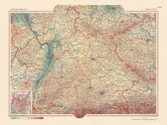 Ancienne carte du sud de l'Allemagne, 1967: Rhénanie-Palatinat, Bade-Wurtemberg, Thuringe, Hesse, Bavière