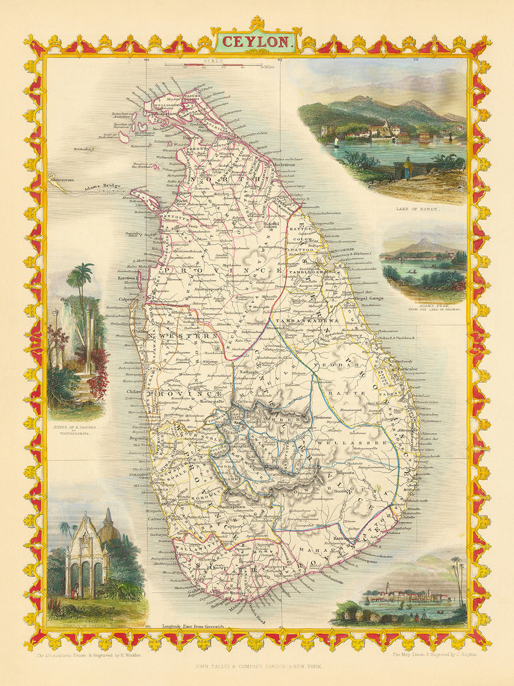 La "Carte de Ceylan" par John Tallis & Company, gravée par J. Rapkin en 1851, est un exemple éblouissant de la cartographie du 19e siècle. Cette carte capture l'essence de Ceylan, maintenant connu sous le nom de Sri Lanka, avec un détail et un art remarquables. Tallis, l'un des derniers grands cartographes décoratifs, est célébré pour ses vignettes exquises qui ornent la carte, représentant des scènes et des monuments indigènes. Les vignettes incluent le serein Lac de Kandy, le majestueux Pic d'Adams depuis le Lac de Colombo, la ville animée de Colombo, le sacré Temple de Bouddha à Kalany, et les évocatrices Ruines du Dagora à Toopharamaya. Ces illustrations non seulement améliorent l'attrait visuel mais offrent également un aperçu de la beauté culturelle et naturelle de Ceylan au milieu du 19e siècle.
