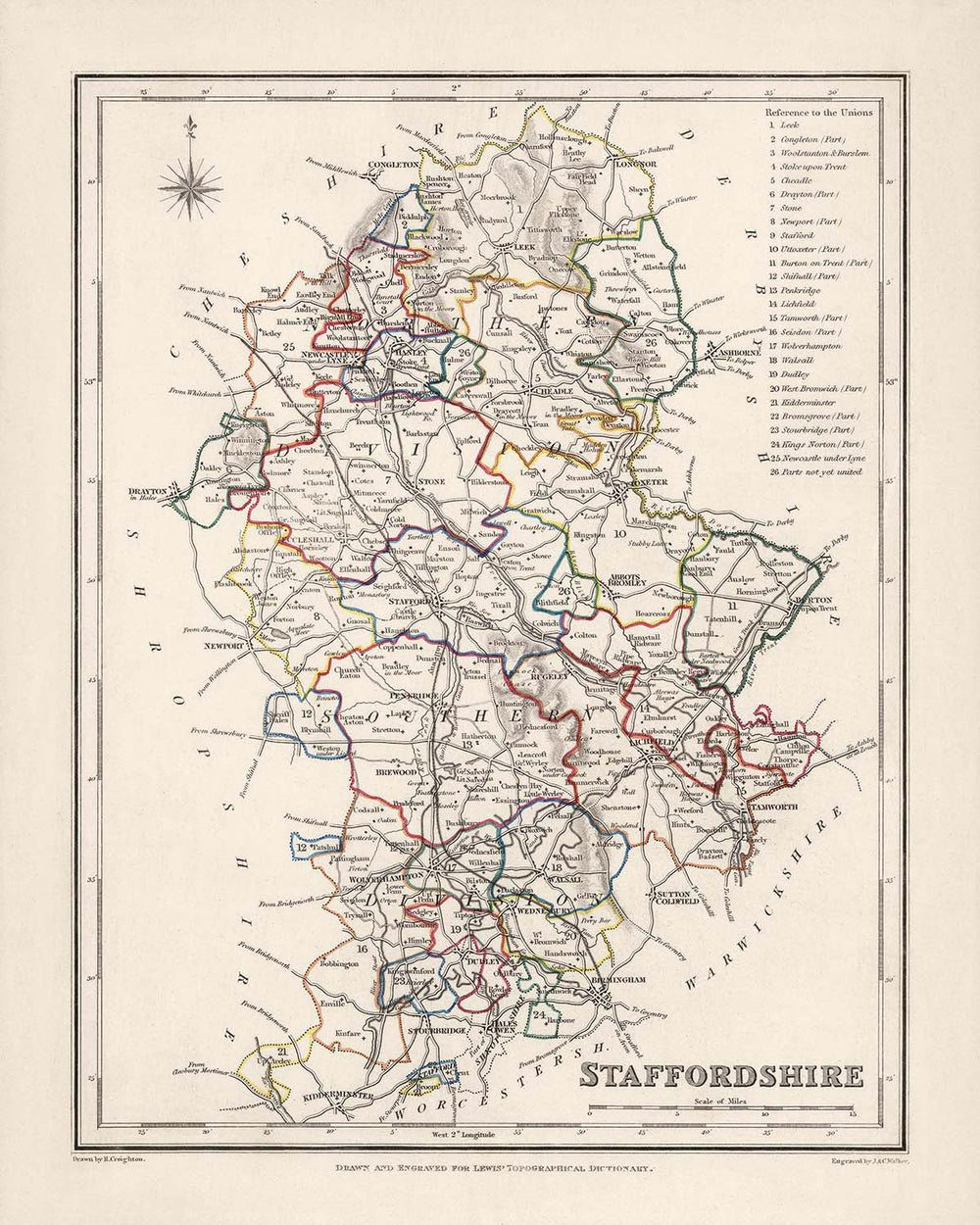 Ancienne carte du Staffordshire par Samuel Lewis, 1844 : Wolverhampton, Stoke-on-Trent, Lichfield, Tamworth, Cannock Chase