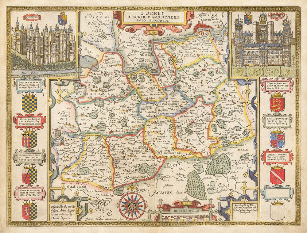 De nombreuses villes, villages et cités du Surrey sont déjà visibles sur cette carte. Curieusement, il y a des gravures de deux palais qui n'existent plus : le Palais de Richmond en haut à gauche et le Palais de Nonsuch en haut à droite. Tous deux étaient des palais Tudor dans les années 1500.