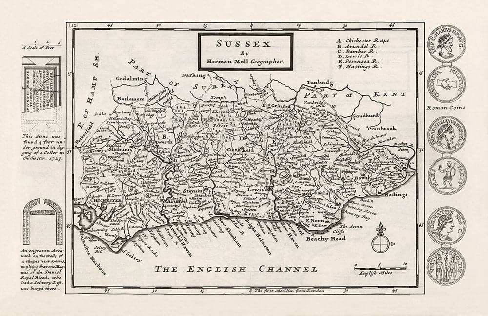 Ancienne carte de Sussex 1724, par Herman Moll: Worthing, Crawley, Brighton, Bognor, Eastbourne