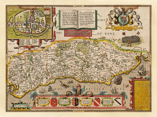 De nombreuses villes, villages et cités du Sussex sont déjà visibles sur cette carte. Chichester - la capitale du West Sussex aujourd'hui - était la capitale du Sussex à l'époque. Il y a une belle image détaillée de Colchester telle qu'elle était en 1611 dans le coin supérieur gauche.